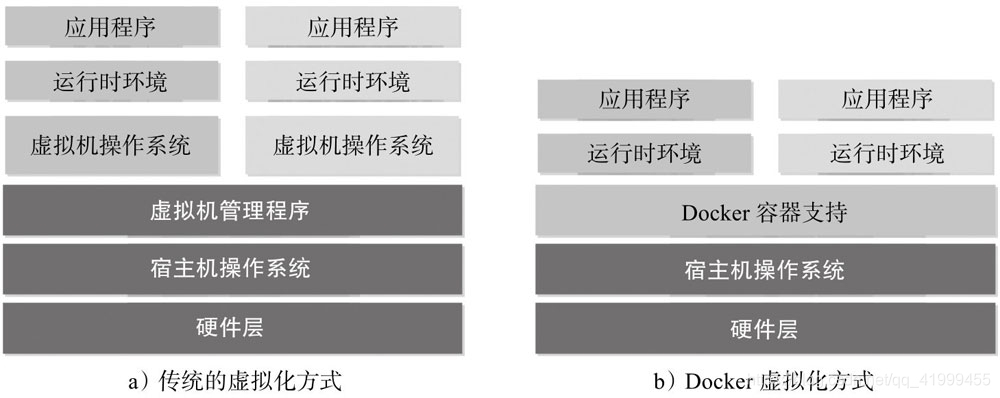 传统方式是在硬件层面实现虚拟化,需要有额外的虚拟机管理应用和虚拟机操作系统层。Docker容器是在操作系统层面上实现虚拟化,直接复用本地主机的操作系统,因此更加轻量级。